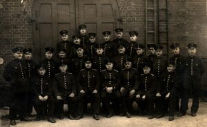 Anlass dazu, diesen Artikel zu schreiben war eigentlich die Tatsache, dass mein Urgroßvater, Albert Hillmann, Anfang des 20. Jahrhunderts selbst Feuerwehrmann in Hamburg war. So hoffte ich, den Text etwas persönlicher gestalten zu können, aber leider konnte ich nicht einmal den Ort bestimmen, wo das folgende Foto entstand, auf dem er in der Mitte der ersten Reihe zu sehen ist.